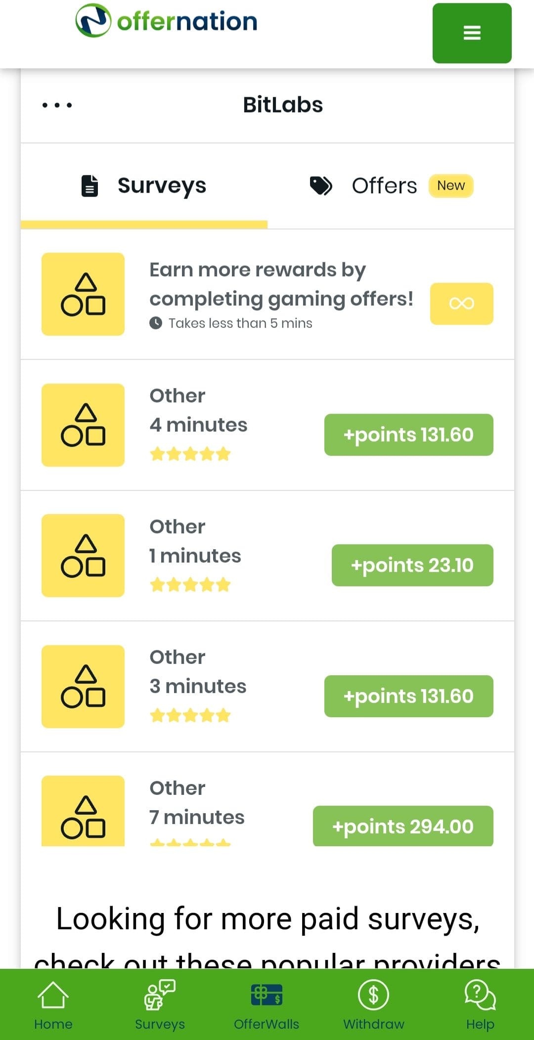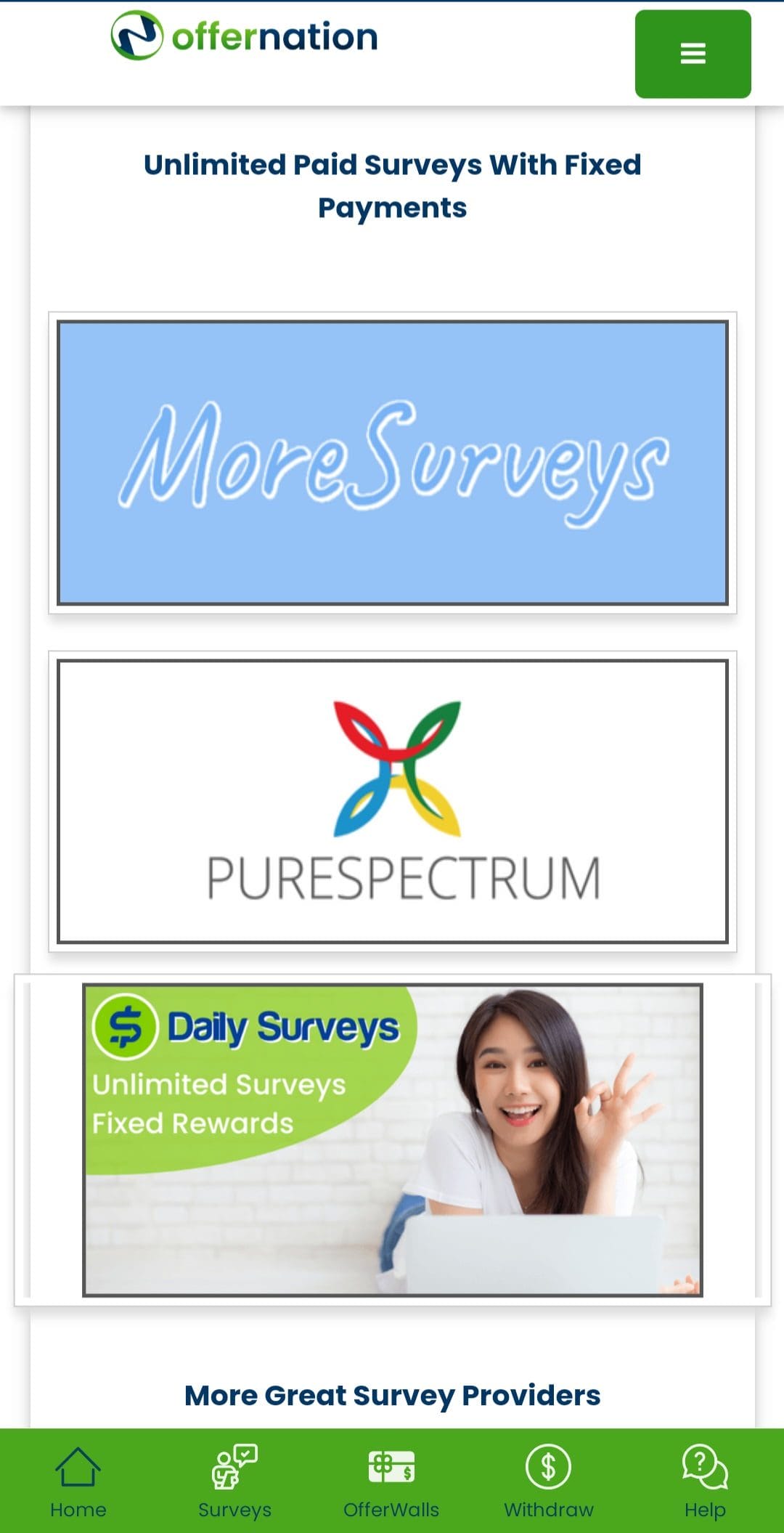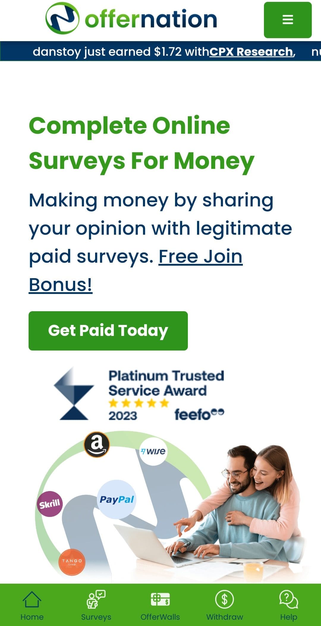 Offernation.com is a reputable and reliable platform that offers paid surveys etc and you can earn extra cash from the comfort of your home. With a vast selection of surveys from various industries and interests, you can easily supplement your income and fulfill your financial goals without any hassle. With a user-friendly interface and seamless navigation, you can focus on completing paid surveys and maximize your earnings without being bogged down by technical difficulties. With multiple payment options like PayPal, Skrill, or Amazon gift cards, you can withdraw your earnings quickly and enjoy the fruits of your labor without any delays. Sign up today and embark on a fulfilling journey towards financial independence and success.