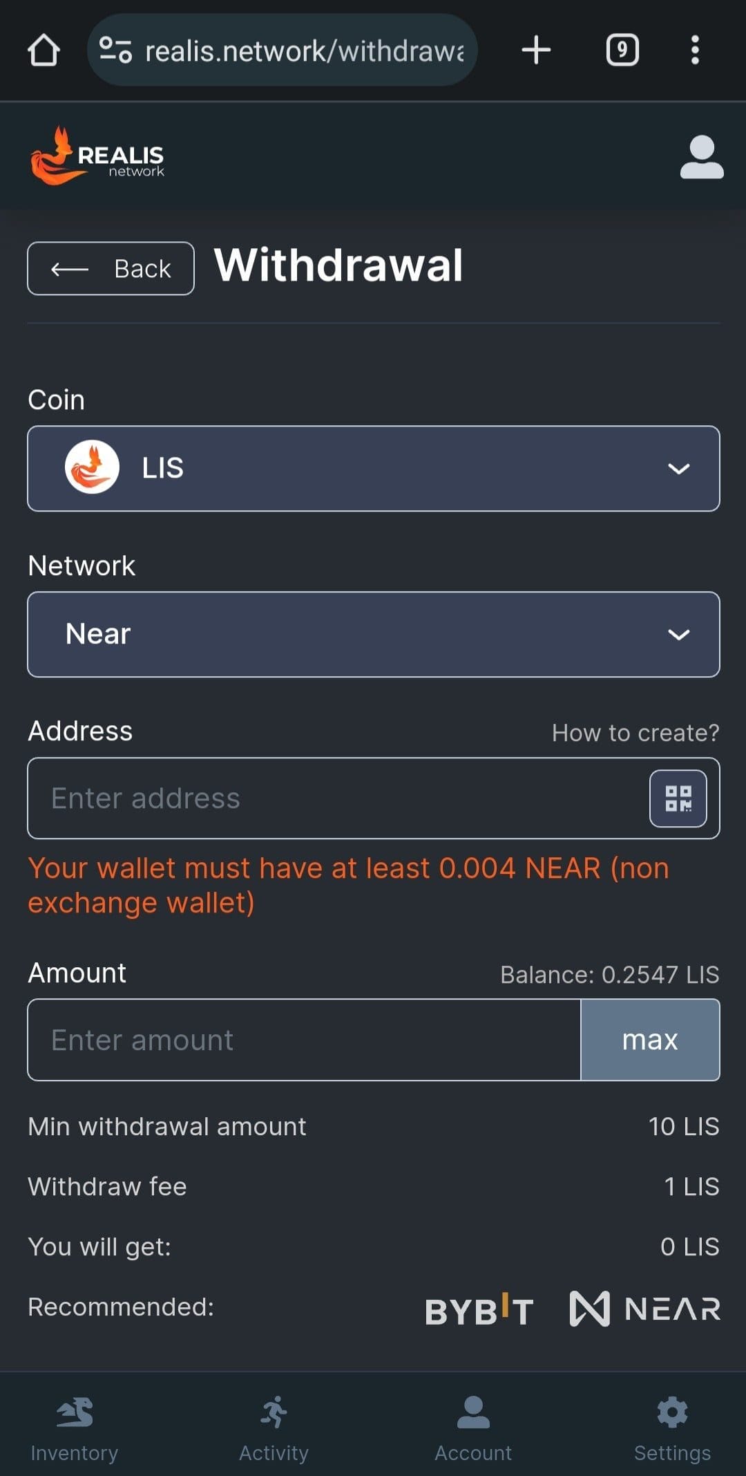 Near – 0.004 LIS (withdraw fee: 1 LIS)